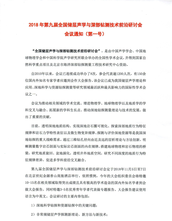 2018年第九届全国储层声学与深部钻测技术前沿研讨会会议通知(第一号)