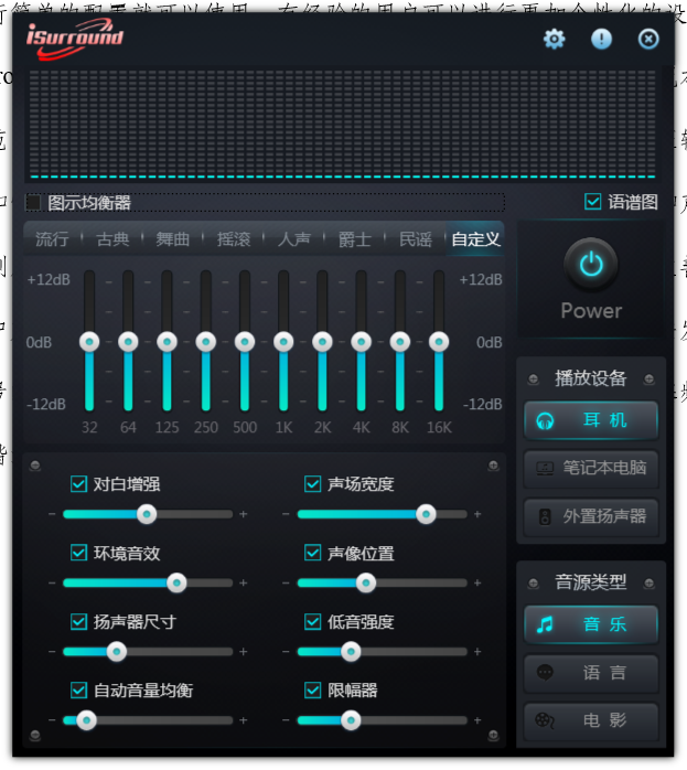 iSurround音效软件是专门为个人电脑打造的Windows平台音效增强套件。它是利用两只扬声器或一副立体声耳机来制造出逼真的环绕立体声体验,营造真实自然的空间声场,改善聆听感受。iSurround的主要功能包括对白增强、声场扩展、环境音效、声像位置调整、动态范围控制、低音增强和语谱分析等等。针对不同的播放设备(耳机、笔记本扬声器、外置扬声器)和不同的音源类型(音乐、语言、电影)进行了个性化的性能优化和音效配置,一般用户只要对这两个选项进行简单的配置就可以使用,有经验的用户可以进行更加个性化的设置。