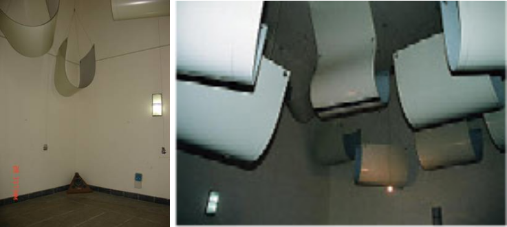 大混响室始建于1964年,2003年进行翻修,长×宽×高=8.4m×7.03m×7.2m =426m3,混响时间由混响时间由125Hz的15.9秒逐渐光滑地下降到4KHz的3.8秒,本底噪声平均值为15.5dBA。大混响室可用于材料的吸声系数、空气中的声吸收、各种声源的声功率和频谱、以及扬声器的效率等声学测量和产生人工混响等。