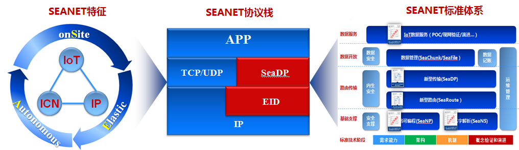 面向万物互联新时代网络需求,以兼容IP设施为前提,采用标识与地址分离的信息中心网络(ICN)技术,将现场服务(onSite)、弹性交付(Elastic)、自治框架(Autonomous)的特性赋能网络,构建以数据为中心的新型5G网络技术体系SEANET。相关工作已获国际同行认可并处于领先地位,自2017年11月起,牵头在国际电信联盟(ITU)成功立项5项国际标准,并已获批准三项。