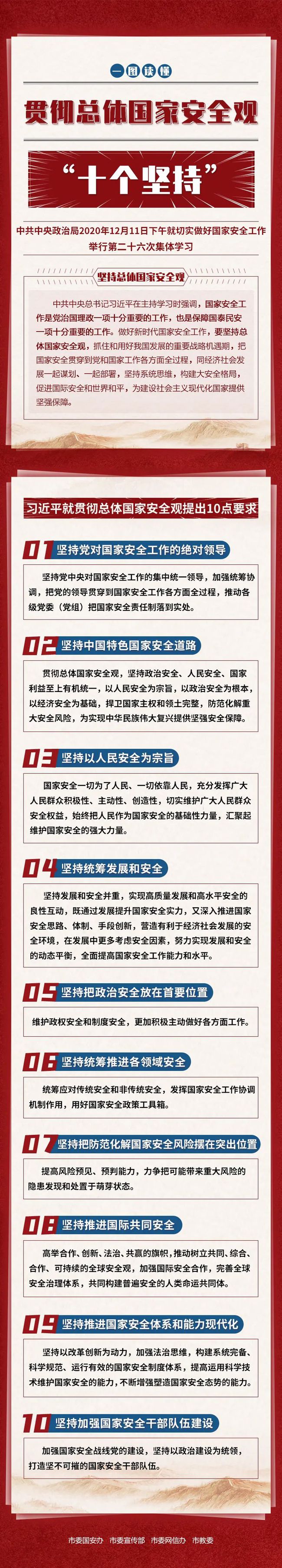 1.要深入开展国家安全专题学习教育主题活动。各部门要组织所属人员围绕主题,坚持以总体国家安全观为指导,紧密结合庆祝中国共产党成立100周年,紧密结合深入学习贯彻党的十九届五中全会、中央政治局第二十六次集体学习会议精神,深刻领会总体国家安全观“十个坚持”丰富内涵,紧密结合常态化疫情防控实际,推动总体国家安全观深入人心、落地生根(详见附件)。