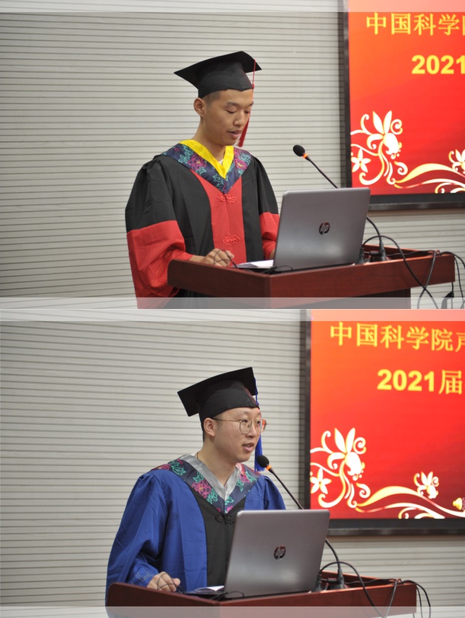 博士毕业生侯森、硕士毕业生张洁分别作为代表上台发言。两位同学的发言回忆了研究生生涯中的点点滴滴,流露了对东海站的依依不舍以及对未来的满心期盼;感恩导师对自己孜孜不倦的教诲,感谢同窗们的相互扶持,为师弟师妹们送上了诚挚的祝福。