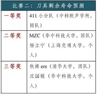 来自中科院噪声与振动重点实验室的刘思辰、刘锋和万伊三人组成的团队“411小分队”参加了刀具剩余寿命预测竞赛决赛。经过答辩与专家讨论,综合预测模型分数与答辩分数,“411小分队”最终以领先第二名10分的绝对优势拿下冠军,获得一等奖,来自华中科技大学、上海交通大学和清华大学的其他四支队伍分别获得二等奖和三等奖。