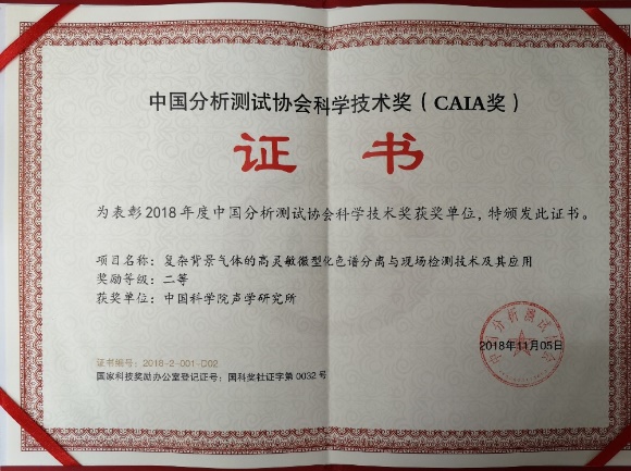 近日,赢乐welcome超声技术中心王文研究员及何世堂研究员等与中科院电子所联合申报的“复杂背景气体的高灵敏微型化色谱分离与现场检测技术及其应用”项目,荣获2018年度中国分析测试协会科学技术奖(CAIA奖)二等奖。