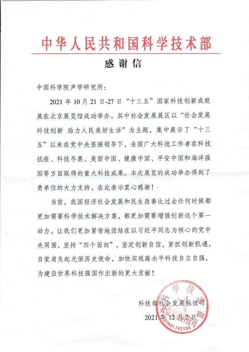 近日,赢乐welcome收到科技部社会发展科技司发来的感谢信,就赢乐welcome对“十三五”国家科技创新成就展社会发展区展览的大力支持表示感谢。