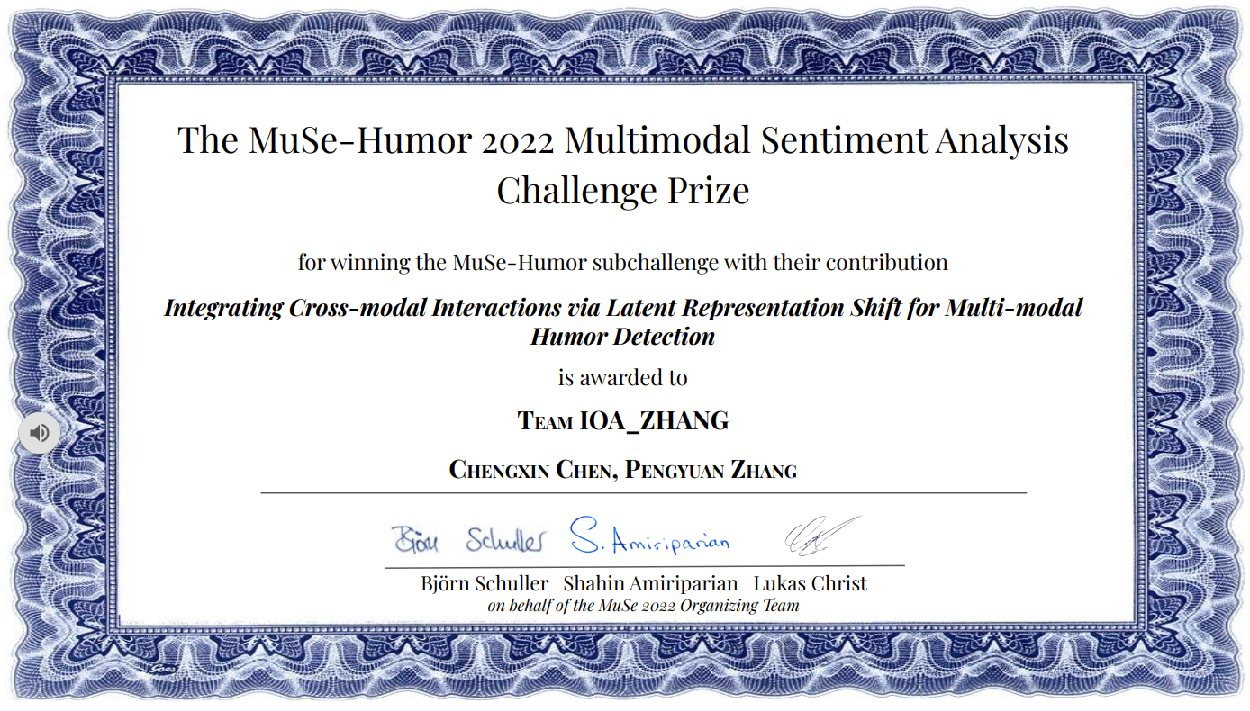 多媒体国际顶级会议ACM Multimedia于2022年10月10日至14日在里斯本成功举办。会议上公布了多模态情感识别挑战赛 MuSe-Challenge(The Multimodal Sentiment Analysis Challenge)的结果。中科院语言声学与内容理解重点实验室的张鹏远研究员带领博士研究生陈城鑫参加了此次挑战赛,并获得多模态幽默检测赛道(MuSe-Humor)的冠军。