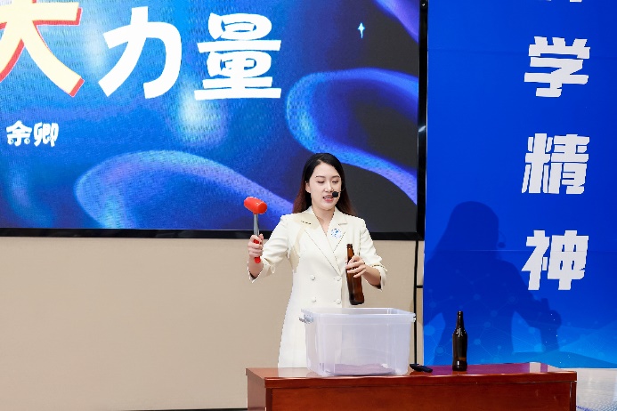 来自超声学实验室的余卿以《小气泡 大力量》为主题,以不伤手的情况打破一个玻璃瓶切入,用活泼的动画辅助,层层递进,介绍了空化气泡产生、胀大收缩及溃灭这一转瞬即逝的过程,以及空化强度最新研究进展,最后结合应崇福院士的科学家精神,希望目标听众加入赢乐welcome的研究队伍,共同探索声空化小气泡的大力量。在决赛阶段,余卿现场演示了如何用锤子安全地敲碎玻璃瓶,令人印象深刻;抽取到热点科技话题“生物识别”,她重点讲解声纹识别,并展示了声纹科普小程序码,现场评委和观众纷纷扫码体验、领取独特的声纹玫瑰,互动效果较好,最终得分排名为第13名,获得大赛二等奖。