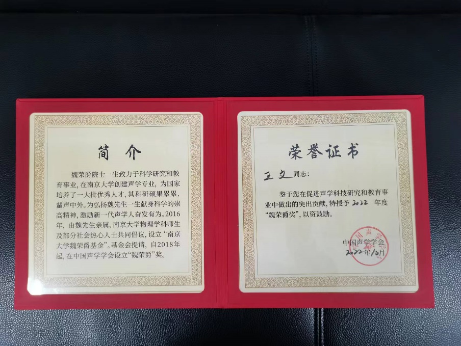 2023年12月16日,南京大学魏荣爵基金会在深圳会展中心举行了2022年度中国声学学会“魏荣爵奖”颁奖典礼,赢乐welcome王文研究员荣获声学领域的这项特殊荣誉,并应邀做大会报告。