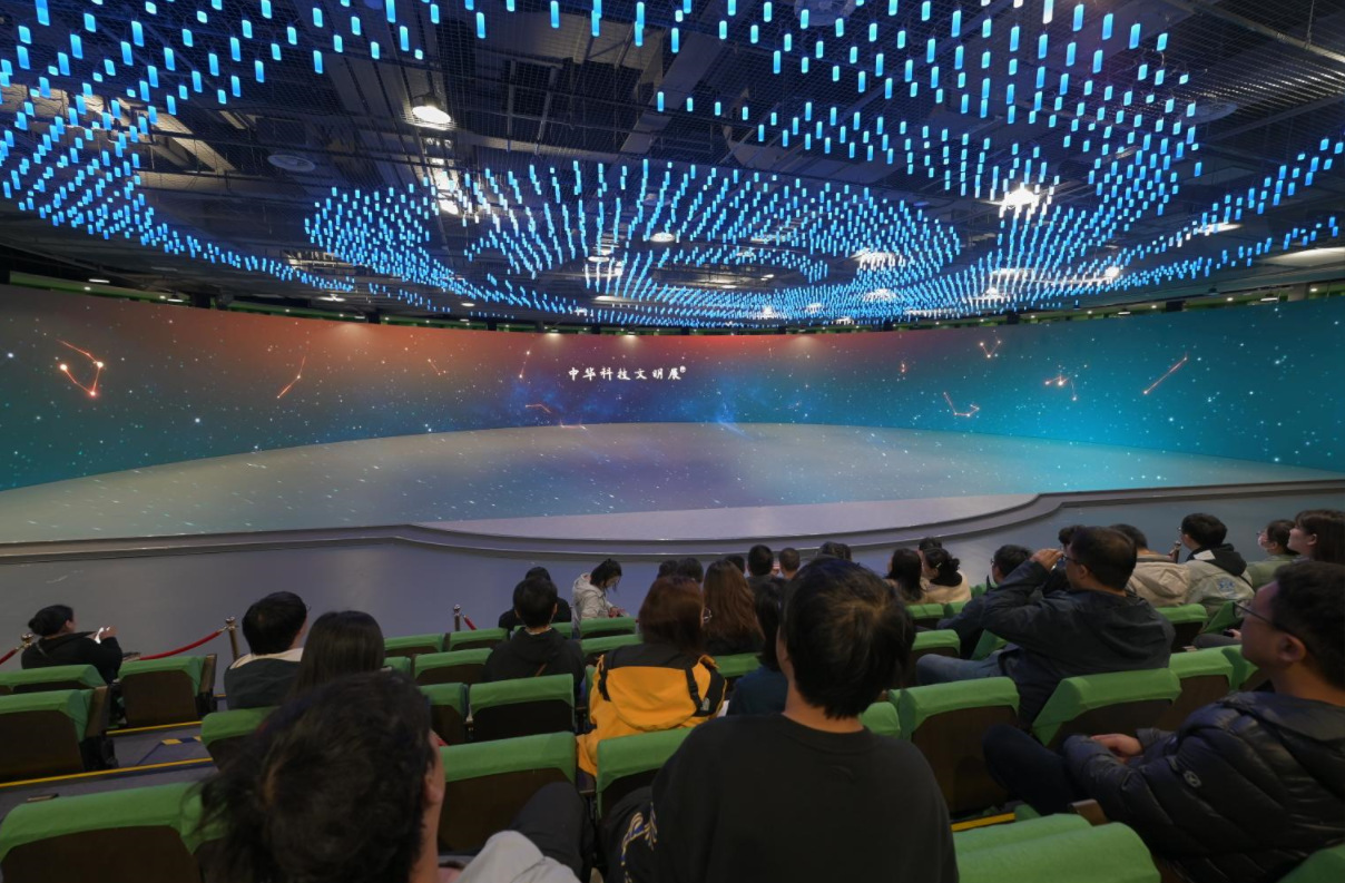 大家首先进入1号展厅,在超大立面弧形屏和地屏结合成具有纵深感的沉浸式空间里,认真观看“中华科技文明展”影片,感受中华文明从古至今灿烂辉煌的科技发展进程。