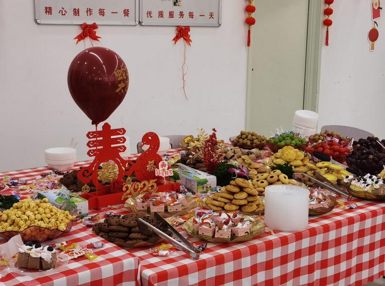 自助餐厅精心准备了多种糕点、小吃和各地特色美食。此外,还举办了套圈活动,并准备了水果、饮料、蛇年特色玩偶、调味品等丰富的礼品。大家热情高涨,反响热烈,活动现场气氛温馨而欢乐。