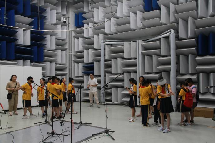 同学们随后参观了水声学及空气声学实验室,学习了水声换能器的工作原理,了解了如何利用消声水池模拟海洋环境开展水声试验,体验了如何利用消声室的特殊结构让回声“消失”,加深了对声传播特性的理解。这些科学知识与实验现象激发了同学们浓厚的学习热情,让大家领略到声学的独特魅力。