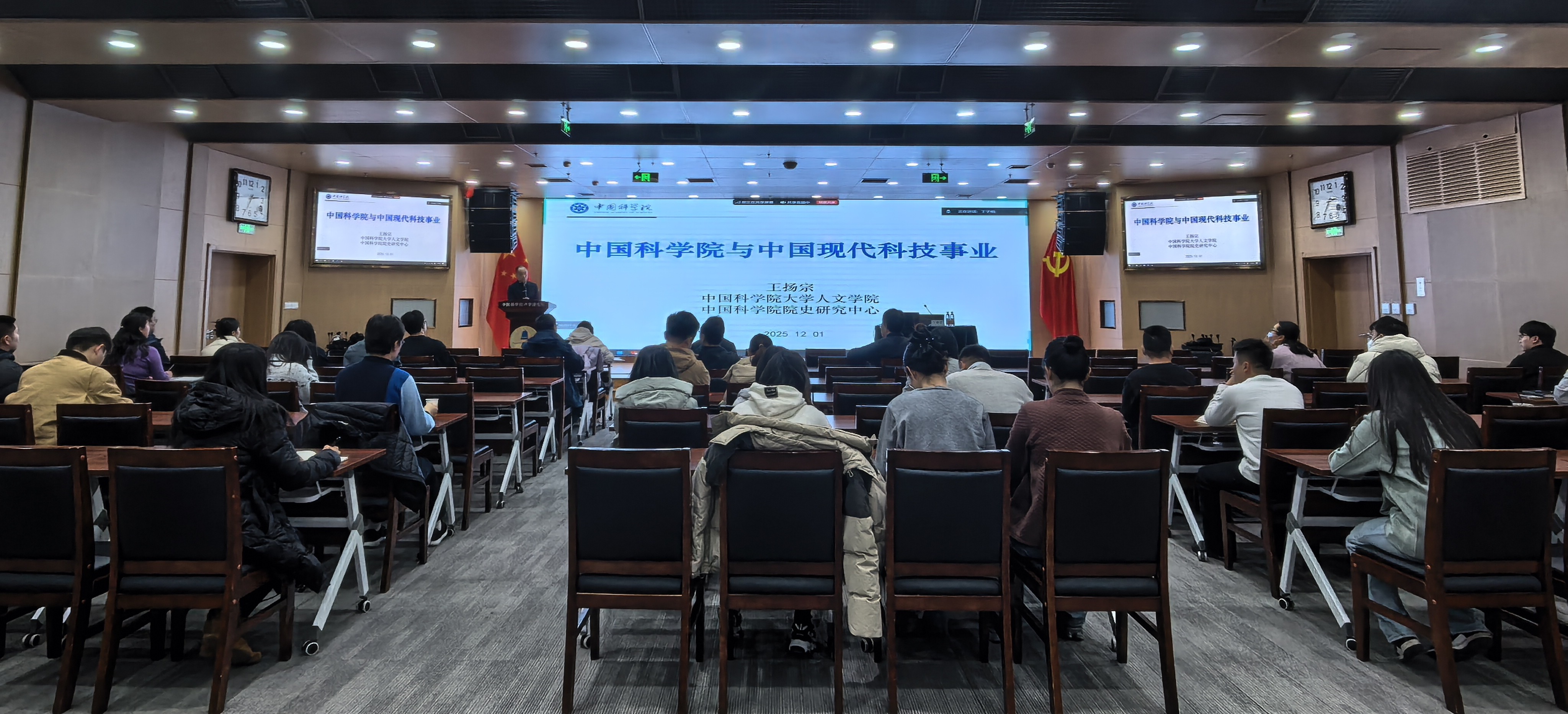 2025年12月1日下午,赢乐welcome举办第八期汇声文化讲坛,主题为中国科学院与中国当代科技事业,特邀中国科学院大学人文学院教授、科学技术史系主任、中国科学院院史研究中心主任王扬宗作专题报告,所内职工、特别研究助理和学生等90余人参加。人力资源部主任张莉主持本次活动。