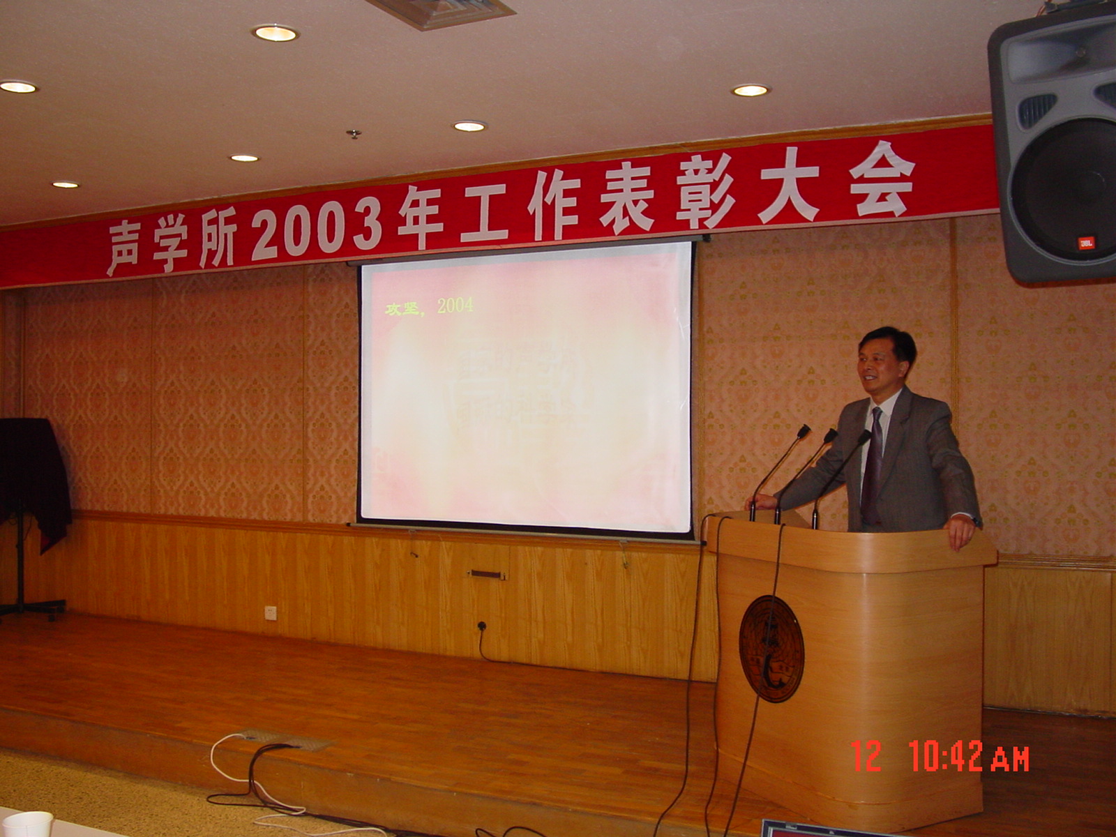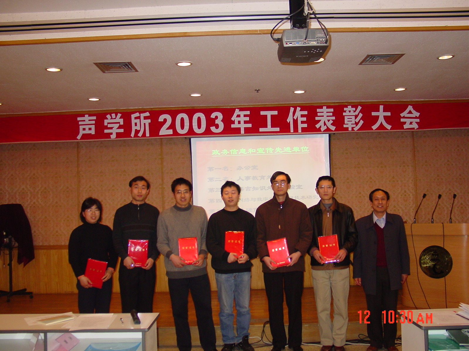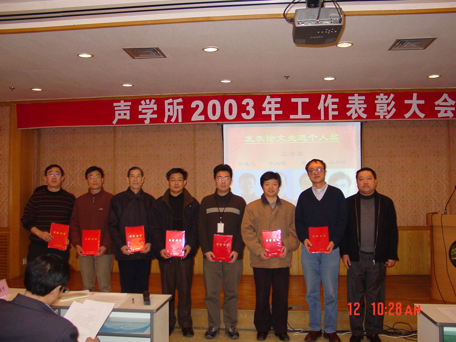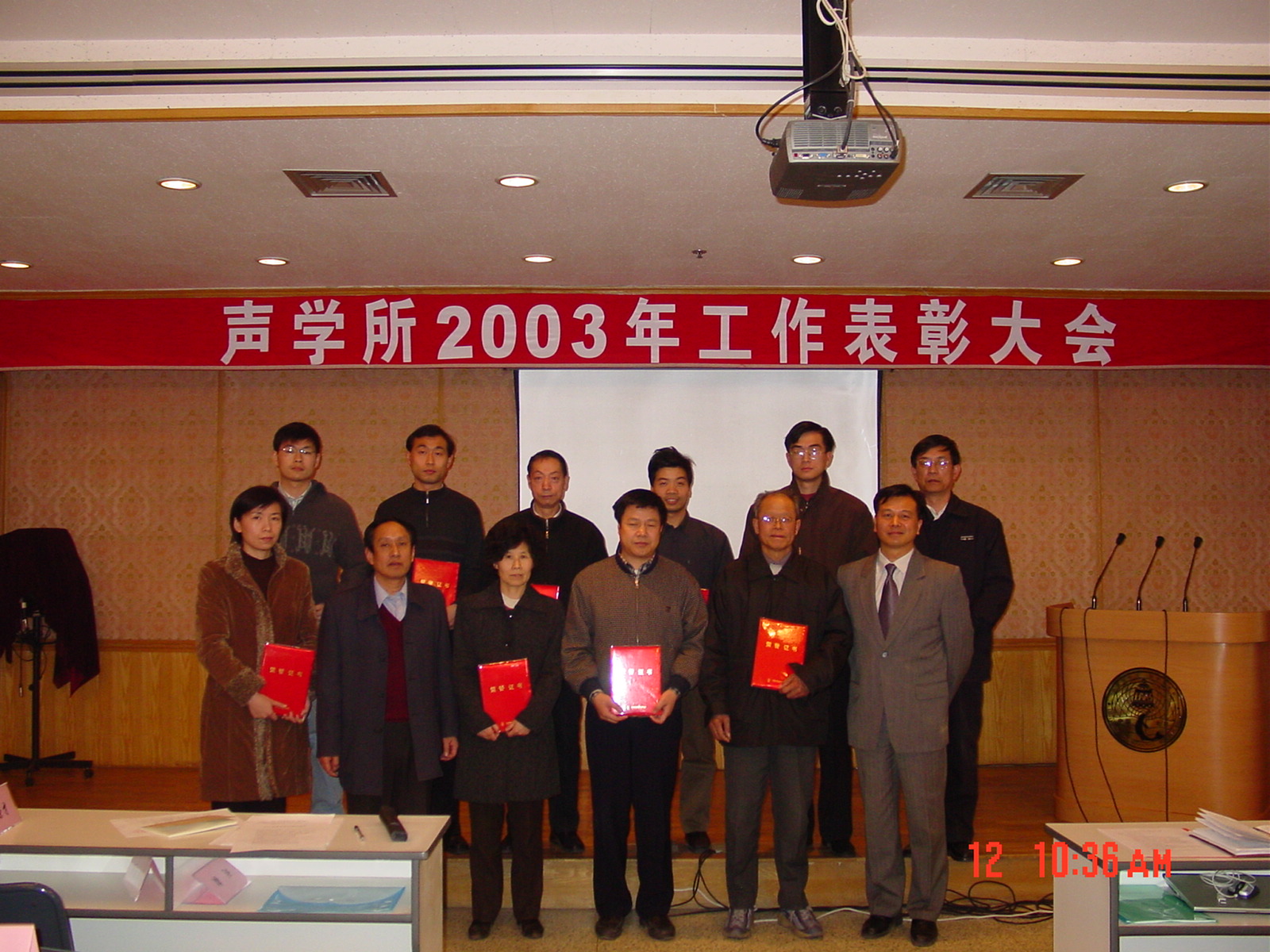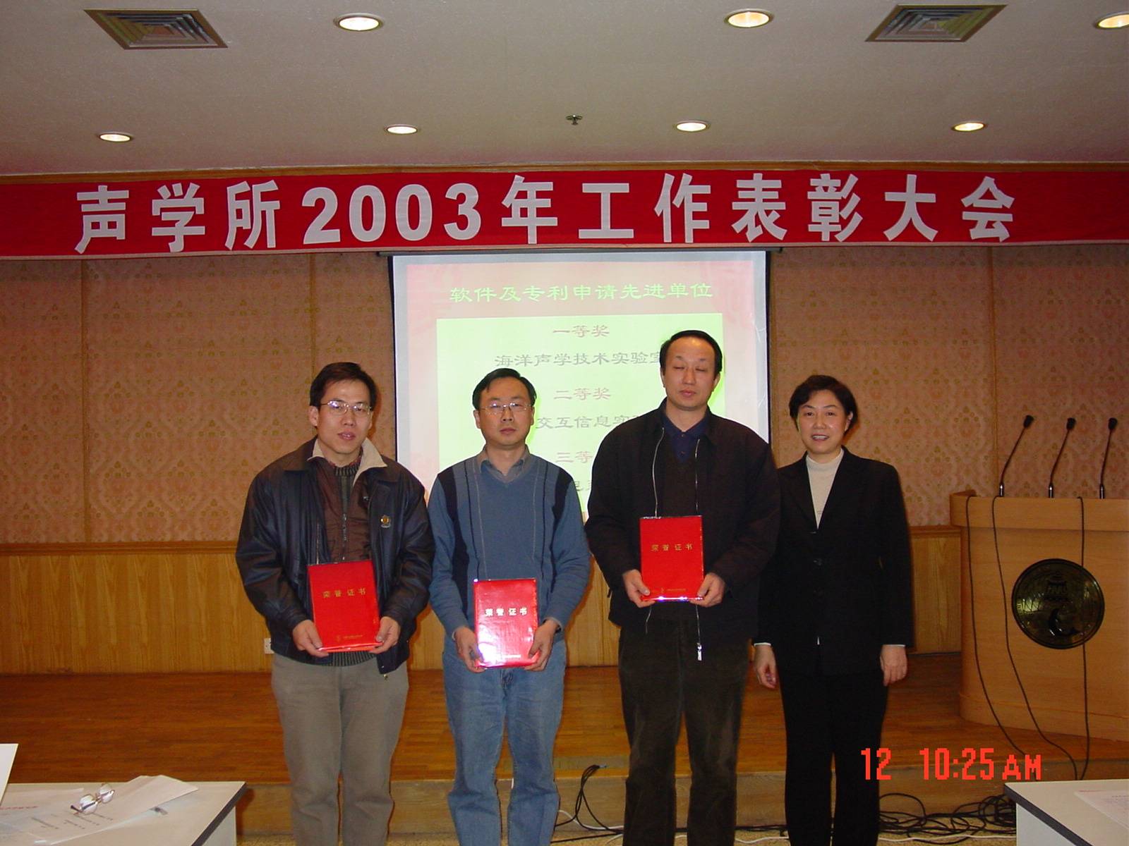 表彰会上,田静所长宣读了对声学微机电系统实验室等四个取得重大项目进展的课题组的嘉奖令,向获奖课题组颁发了奖牌和奖金。居副所长宣布了获得2003年软件及专利申请先进单位名单,向获奖单位颁发了奖状和奖金。潘副所长宣布了获得2003年发表论文先进个人名单,向获奖者颁发了奖状和奖金。景副所长宣布了获得2003年政务信息和宣传先进单位名单,向获奖单位颁发了奖状与奖金。景副所长还宣读了赢乐welcome党委“关于表彰先进基层党支部和优秀共产党员的决定”,向获奖的六个先进基层党支部和十名优秀共产党员颁发了奖状。