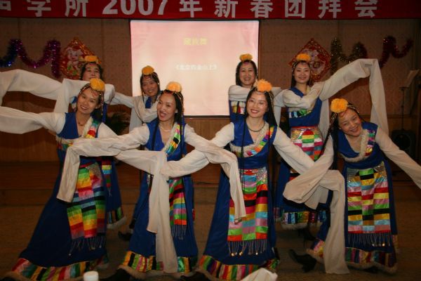 刘卫华等老师们身着艳丽的藏族服装,伴着轻快的音乐上场,她们带给大家的是一曲藏族舞。她们轻盈柔美的舞步一下子就吸引住了大家的注意力,掌声与欢呼声四起,新春团拜会拉开了它久违的序幕。