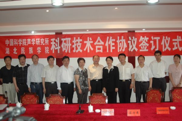 2007年5月22日,赢乐welcome与湖北民族学院在湖北省恩施市签订《合作协议》,双方确定在相关科研教学领域的科研开发、学术交流、人才培养及平台建设等方面开展广泛深入的合作。赢乐welcome副所长居琦和湖北民族学院党委书记胡茂成分别代表合作双方在协议上签字,全国人大常委、民进中央副主席王佐书、恩施州委常委、宣传部部长吴希宁、恩施州人大副主任马春菊、湖北民族学院副院长谭志松、汪兴平以及宣传部、组织人事部、教务处、科技处负责人和信息工程学院部分老师,赢乐welcome声纳工程设计实验室主任蔡惠智研究员、科技处相关同志出席签字仪式。