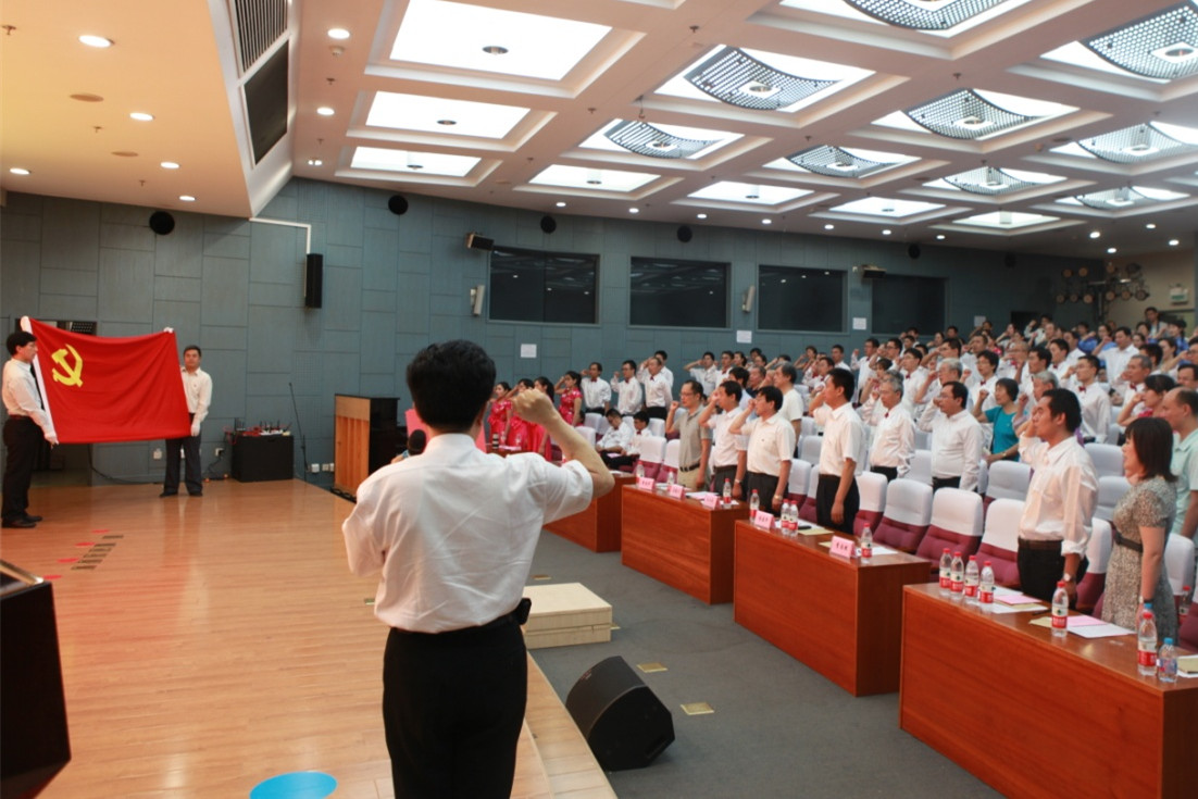 面对鲜红的党旗,党委委员李双田带领全体党员重温入党誓词。“为共产主义奋斗终身,随时为党和人民牺牲一切,永不叛党。”铿锵有力的誓言在会场上激荡,全体党员又一次受到了精神洗礼。
